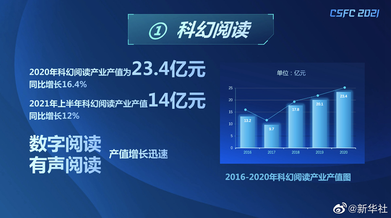 2021中國科幻大會最新發布的《2021中國科幻產業報告》顯示,今年上半年,我國科幻產業產值已達362.92億元。其中,上半年科幻閱讀產業產值14億元,同比增長12%,數字閱讀、有聲閱讀產值增長迅速。