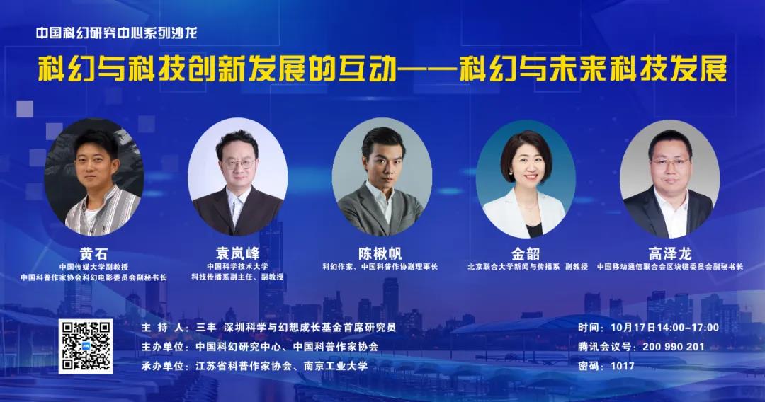 10月17日,由中國科幻研究中心、中國科普作家協(xié)會主辦,江蘇省科普作家協(xié)會和南京工業(yè)大學承辦的“科幻與科技創(chuàng)新發(fā)展的互動——科幻與未來科技發(fā)展”主題沙龍以線上方式順利舉行,來自中國科學技術(shù)大學、中國傳媒大學、北京聯(lián)合大學、中國科普作家協(xié)會、中國移動通信聯(lián)合會的專家學者參加了沙龍討論。深圳科學與幻想成長基金首席研究員三豐主持會議。