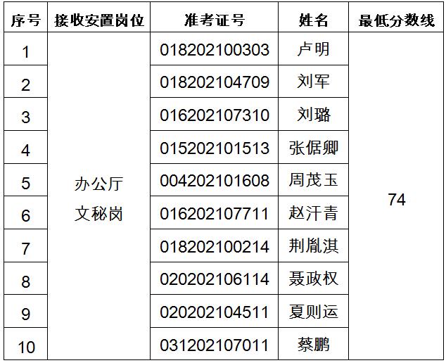 根據(jù)轉(zhuǎn)業(yè)軍官統(tǒng)考成績(jī),按接收崗位1:10的比例確定專業(yè)能力測(cè)試和面試人員。如有不能參加專業(yè)能力測(cè)試和面試的,按照統(tǒng)考成績(jī)從高到低的順序遞補(bǔ)。遞補(bǔ)人員名單不再另行公告,以電話通知為準(zhǔn)。各崗位專業(yè)能力測(cè)試和面試人員(按姓氏筆畫排序)、準(zhǔn)考證號(hào)及最低分?jǐn)?shù)線如下。