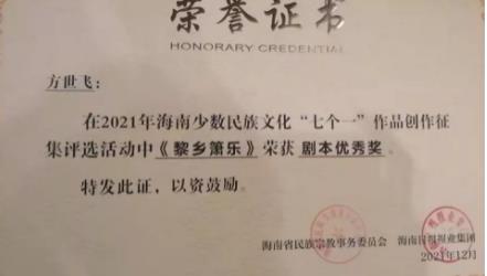 1月9日,2021年海南省少數民族文化“七個一”作品創作征集評選活動在海口舉行頒獎禮,全國少兒科幻聯盟作家柯漁(本名方世飛)的海南黎族傳統文化題材劇本《黎鄉簫樂》榮獲劇本優秀獎。