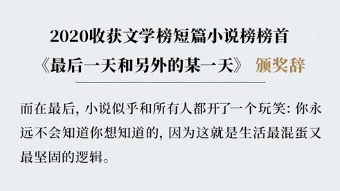 《最后一天和另外的某一天》獲得了2020年收獲文學(xué)榜短篇小說榜榜首,書寫的是一個(gè)女殺人犯的故事。一個(gè)女人在監(jiān)獄里待了整整十七年,成為了監(jiān)獄里的頭號模范犯人。這個(gè)女人身上到底發(fā)生了什么樣的故事?對這個(gè)問題的探尋一直貫穿于我們的閱讀體驗(yàn)中。收獲文學(xué)榜頒獎(jiǎng)辭對小說的理解是這樣的:“小說試圖窺探這個(gè)女人謎一樣的人生,卻發(fā)現(xiàn)終究所得有限。在不得已的情況下,小說設(shè)置了戲中戲,一部以此女人為原型的戲劇在舞臺上演,作為原型的女人坐在觀眾席里冷若冰霜。這是作家和他作品中人物的角力,在這個(gè)意義上,艾偉的這篇小說帶有“元小說”的氣質(zhì),因此小說有兩個(gè)文本面向,在表層文本里,女犯人的故事以懸疑劇的方式勾起了讀者足夠多的好奇心;在深層文本里,這是一個(gè)關(guān)于作家無法馴服其作品人物的故事,它暗示了藝術(shù)的高度和限度。而在最后,小說似乎和所有人都開了一個(gè)玩笑:你永遠(yuǎn)不會(huì)知道你想知道的,因?yàn)檫@就是生活最混蛋又最堅(jiān)固的邏輯。”《最后一天和另外的某一天》寫了不可理解之理解,因而深不可測。