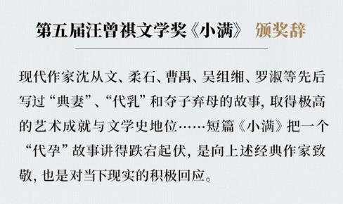 《小滿》講了女性母愛本能和身體的關(guān)系,獲得第五屆汪曾祺文學(xué)獎(jiǎng)。小說講述的是一個(gè)關(guān)于代孕的故事,塑造了女主人公小滿、古董商人白先生、白太太、女傭喜妹這幾個(gè)人物形象。白先生外表斯文,內(nèi)心卻藏著不可告人的秘密;白太太表面平易近人,但也有毫不留情的時(shí)刻;傭人喜妹對主人家忠心耿耿,卻更顯“奴性”,而作為代孕母體的主人公小滿在這場倫理悲劇中,由天真善良變得瘋瘋癲癲。艾偉將故事講得跌宕起伏,讓人物自由生長于文字之間,也回應(yīng)了當(dāng)代的社會(huì)現(xiàn)實(shí)問題。汪曾祺文學(xué)獎(jiǎng)給《小滿》的頒獎(jiǎng)辭強(qiáng)調(diào)了小說的現(xiàn)實(shí)意義:“你若非喜妹,將如何看待類似的代孕故事?作者的追問難以回避,小說的撼人力量正由此而來。”