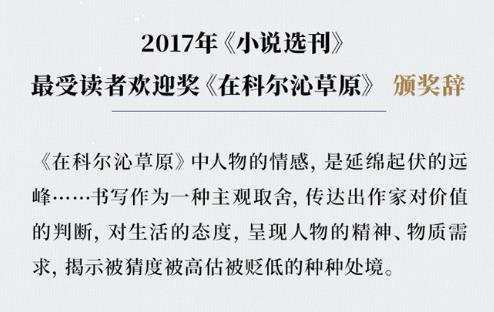 《在科爾沁草原》講述男女之間不可言說的復(fù)雜和曖昧,獲2017年《小說選刊》最受讀者歡迎獎(jiǎng)。頒獎(jiǎng)辭中寫道,“《在科爾沁草原》中人物的情感,是延綿起伏的遠(yuǎn)峰。故事情節(jié)作為“冰山的水上部分”,由富有意味的一系列變化構(gòu)成。這些外在的變化帶來轉(zhuǎn)折的詫異,也體現(xiàn)人物的內(nèi)在訴求。書寫作為一種主觀取舍,傳達(dá)出作家對價(jià)值的判斷,對生活的態(tài)度,呈現(xiàn)人物的精神、物質(zhì)需求,揭示被猜度被高估被貶低的種種處境。”