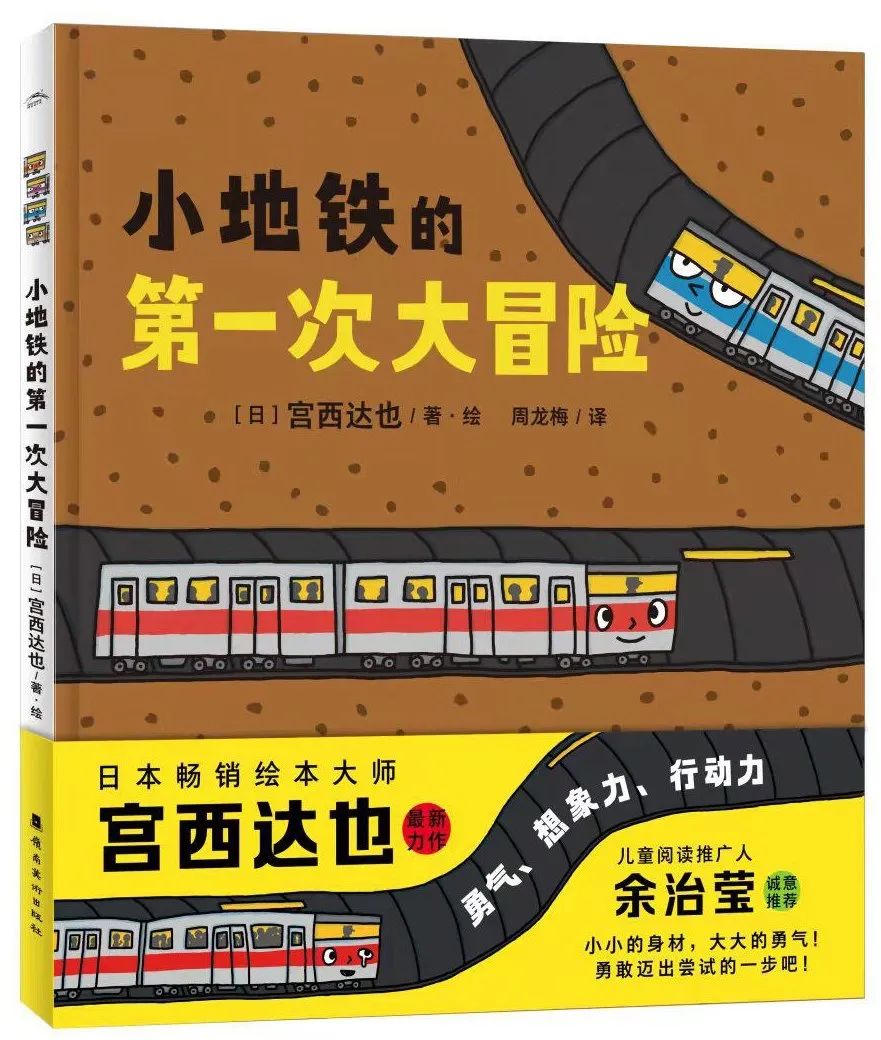 許多孩子的記憶里,宮西達也是溫暖和憂傷的代表。每一只經歷過創傷、又被溫柔以待的小恐龍,都是宮西達也對世界的善意。這些善意,也在他多個系列的故事中始終如一地傳遞。新作《小地鐵的第一次大冒險》中,宮西達也將第一次擔任行駛任務的地鐵列車比作一個進入新環境的孩子。繪本中,外面的世界在小地鐵的想象里充滿離奇古怪的因素:飛機就像鐵鳥滿載乘客、人類都住在盒子一樣的樓房里,太可怕了,會不會有大蛇把隧道咬斷?從膽怯、畏懼,到鼓足勇氣開始探索,再到最終釋懷,開始向更大的世界探索,在簡單童稚的畫風中,小地鐵的心情讓孩子感同身受。作者將他們對未來的期待、好奇和擔憂詮釋出來,給予安撫、寬慰和鼓勵,家有適齡孩子的才會理解這種懵懂的緊張和期待,并會心一笑。