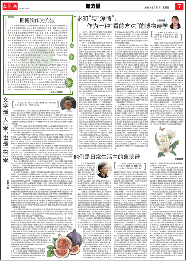 將視野聚焦于當下文學場域,博物學和自然文學、生態文學一樣,正吸引著廣泛的關注和討論。不同之處在于,博物學或博物書寫的邊界似乎更為模糊,牽涉內容也更為繁雜。參與本期討論的劉小波、王書婷,對現當代中國文學中的博物書寫進行了開闊而清晰的梳理,從“看的方法”深度剖析了“博物何以詩學”,分享了諸多具有啟發性的觀察和思考。青年作家盛文強則現身說法,講述“與自然界短兵相接”的心得。而他對于“魚類學家的經驗”與“漁夫的經驗”的區分,別具深意。