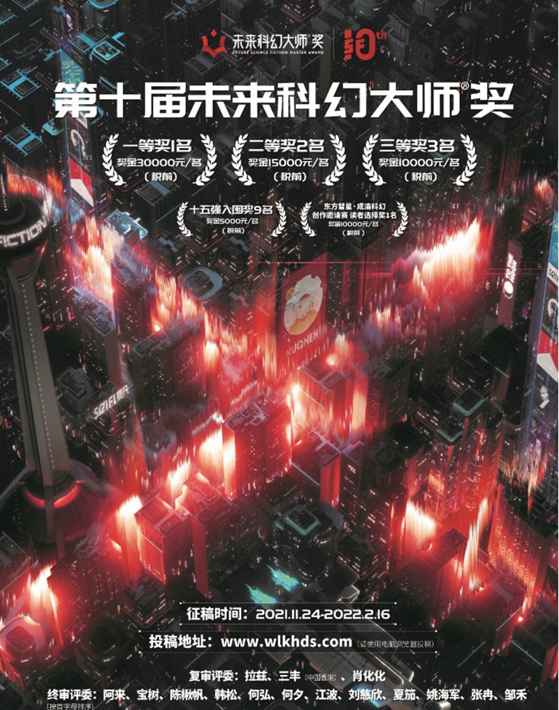 第十屆“未來科幻大師獎”由中國科學技術協會科普部、中國作家協會網絡文學中心、成都市互聯網信息辦公室指導,成都市互聯網文化協會、重慶出版集團、賽凡科幻空間主辦。據成都市互聯網文化協會相關負責人介紹,本屆“未來科幻大師獎”共征集有效中短篇作品919篇,近1200萬字,內容包含未來城市、宇宙航空、未來科技等主題,投稿作者遍布全國25省(自治區、直轄市),參選作品數量再創歷屆新高、投稿作者更加廣泛、“大師獎”品牌效應更加顯著。且本屆大賽評審機制提檔升級,一是評審流程更加公正透明,初審、復審、終審等環節中采用作者匿名評審、分組交叉審閱、復審現場直播等多種形式;二是評委陣容更加權威,終審環節由劉慈欣、阿來、姚海軍等十二位科幻專家組成,力求以更加專業、獨到、精準的視野評選出更多優秀作品。