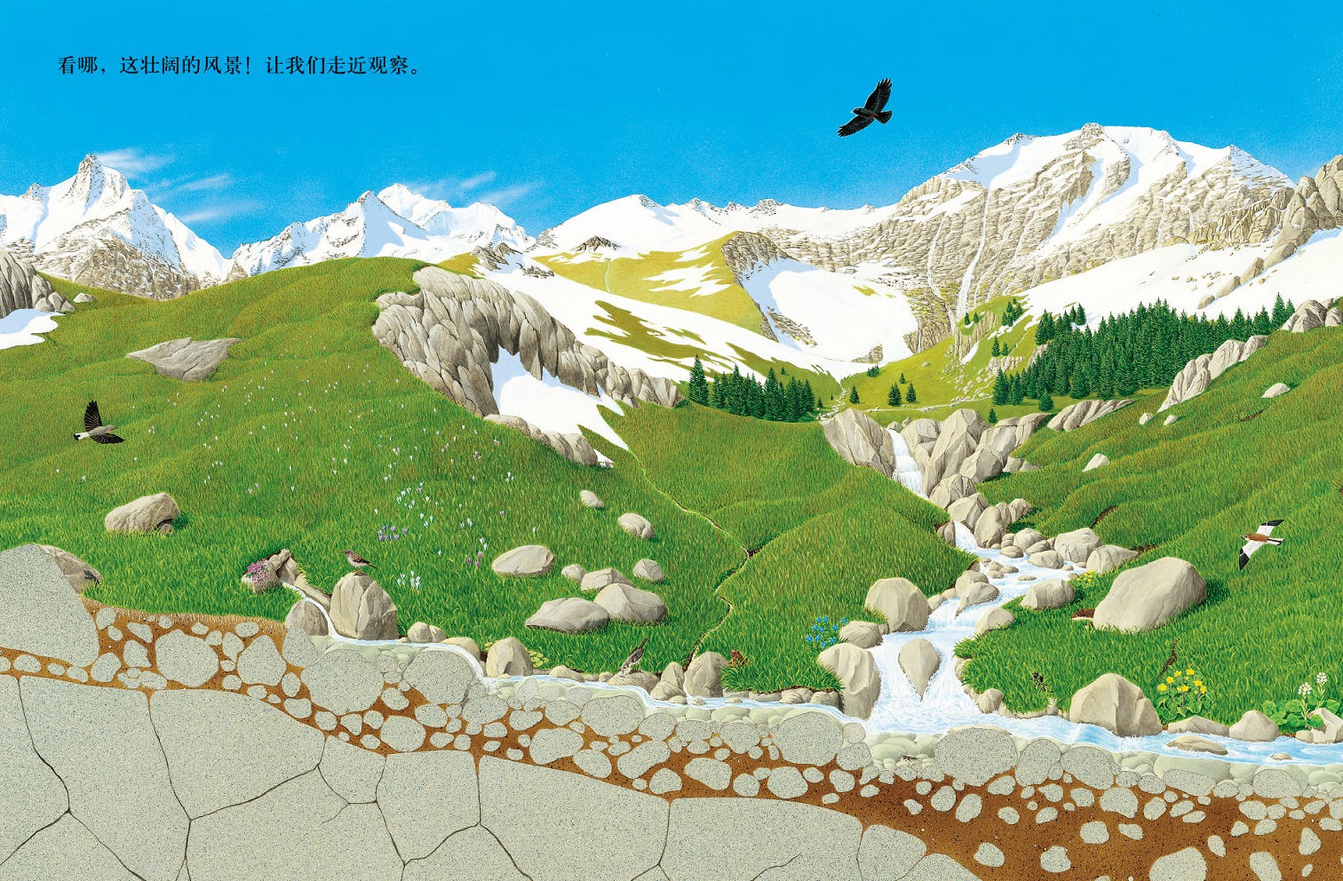 大山、池塘、河流、入海口……每一類地貌都自成一個完備且獨特的小世界。《自然圖鑒》中,作者以細膩筆觸繪制了數百種動植物,表現出山地、池塘、河流和入海口四種地貌中錯綜復雜又相互聯系的動植物生態系統,呈現了開放多樣的野性世界。山地景觀壯麗,但隨著海拔升高,氣溫降低,地面越發崎嶇,生存條件越發艱苦。即便如此,山中各處仍有一些植物和動物能夠存活。池塘和沼澤的生物多樣性令人驚嘆,動植物幾乎能涵蓋全部生物的門類,沼澤雖充滿危險,但同樣生機勃勃。隨著水波的持續奔涌,河流兩岸的風景也在不停變幻,水生植物和魚類在河流中扎根、繁殖,鳥兒和哺乳動物則在水域附近的生態中棲身。百川歸海,河川注入海洋的地方是入海口,海灘同樣是蠕蟲、軟體動物和甲殼動物以及被它們所吸引的魚類和鳥類生活的家園,構成了豐富多彩的生命世界。