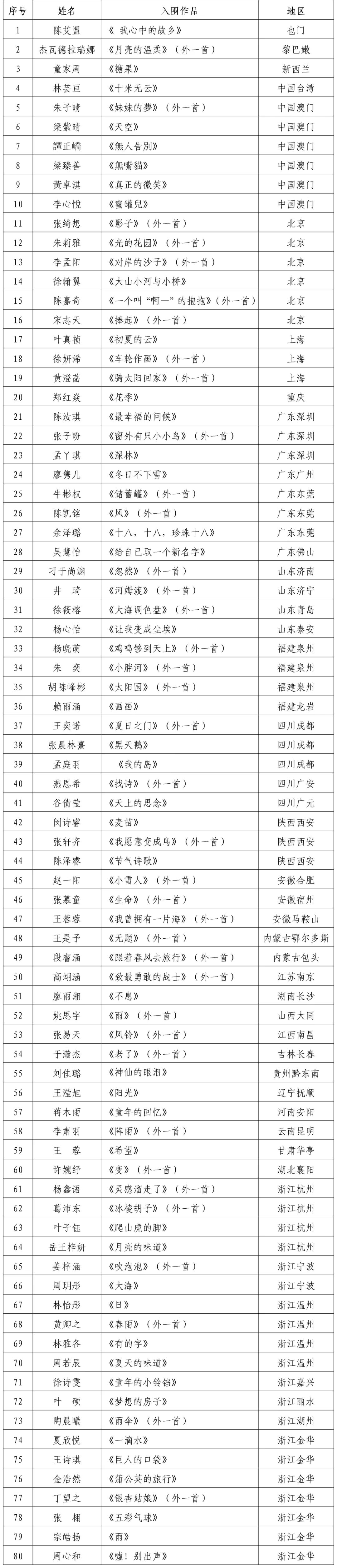 由中國作家協會兒童文學委員會、浙江省作家協會、義烏市人民政府主辦,中國校園文學雜志社學術指導的第三屆義烏駱賓王國際兒童詩歌大賽共收到來自45個國家和地區的投稿作品22056件。所有參賽作品以匿名方式采取篩選、初評、復評等程序,經過中國作家協會原副主席、兒童文學委員會主任、著名兒童文學作家高洪波,中國作家協會兒童文學委員會副主任、浙江省作家協會副主席、浙江師范大學教授方衛平,魯迅文學院副院長、著名兒童文學作家、評論家李東華,上海師范大學教授、著名兒童文學作家蕭萍,中國兒童文學研究會副秘書長馮臻等5名專家組成的大賽評委會評審,產生第三屆義烏駱賓王國際兒童詩歌大賽成人組大獎2名、提名獎8名,青少年組入圍80名?,F將名單公布如下: