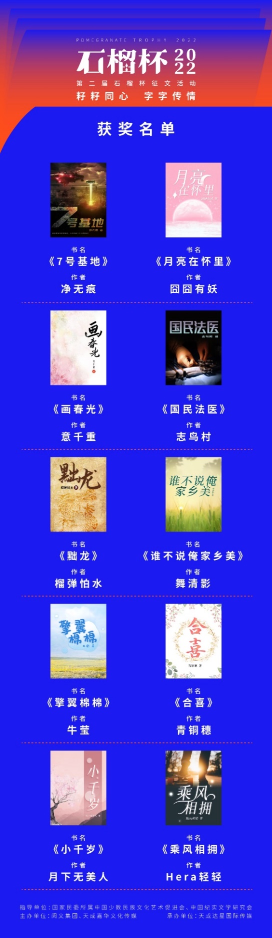 現場揭曉了第二屆石榴杯征文活動的獲獎名單。本屆石榴杯以“籽籽同心 字字傳情”為主題,經專家顧問團、影視平臺推薦及嚴格評審,《7號基地》《月亮在懷里》《畫春光》《國民法醫》《黜龍》《誰不說俺家鄉美》《擎翼棉棉》《合喜》《小千歲》《乘風相擁》等10部網絡文學作品獲得“優秀作品獎”,并將被收錄入中國民族文化資源庫。
