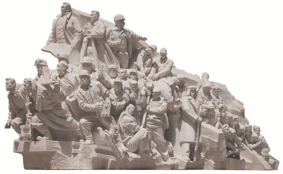 邁入西側廣場,莊嚴矗立的5座大型主題雕塑,給人以視覺震撼和精神力量——《旗幟》“迎風招展”、氣勢如虹;《信仰》《偉業》《攻堅》《追夢》4組雕塑渾然一體、巍峨壯觀。583塊來自四川夾金山腳下的漢白玉,雕刻成276個栩栩如生的人物,匯聚為波瀾壯闊的視覺史詩,生動講述著黨的百年光輝歷程。它們是新時代美術工作者為人民放歌、為時代鑄魂的典范之作。
