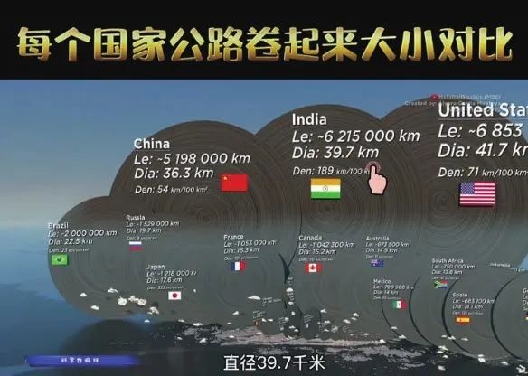 圖1《國家公路對比》形象地展示了各國公路網(wǎng)長度(圖片來自抖音視頻截圖)