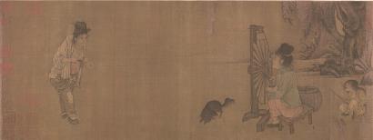 北宋王居正繪《紡車圖》表現農家勞作紡紗的情形。圖繪一位老嫗弓腰駝背,站立紡線,通過兩條線與之連接的是畫面另一側的紡車,車右側有一女子一邊要紡車一邊懷抱嬰孩哺乳,其身后有一幼兒在戲蟾,還有一只黑狗在回首狂吠
