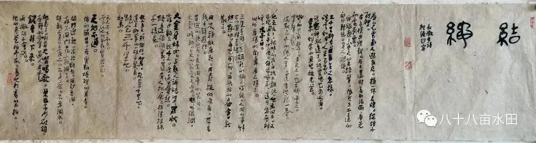 這是我平生真正事筆墨以來,第二次抄讀如此長的文字。第一次是2015年,抄讀之道在印度尼西亞寫的長詩《咖啡園》,那次用了一個禮拜的時間,共抄寫了四大本冊頁。這次抄寫《結繩》,我用了三天時間,在34/136厘米一張的毛邊紙上共寫了11張,這11張橫向豎排下來,就像一個層層排列的墨繩矩陣。《結繩》長征寫了119首,他有意沒寫足120首湊一個偶數整數,而是用一個奇數了結,肯定也有他的深意。我這同樣也為奇數的11張,正好暗合了長征的意圖。抄寫完成后,除了起首和落款,我本不想再在其它頁面上使用印章。我私下忖度,如此長詩構成的繩陣,那行間的崎嶇錯落,墨跡的枯潤干濕,單字的大小繁簡,分布的疏密留白,完全沒必再要用印章來調整。但我還是在每一張上或多或少地蓋了一些。這些印章留下的鮮紅印痕,在黑色的墨跡之中分外奪目。我希望它們即是太陽,也是月亮和星星,照耀著古人,也照耀著今人;照耀著開天辟地的曠世文明,也照耀著紛繁蕪雜的現代生活。同時,我還希望其中最不顯眼的一枚就是我,堅定地站在墨河的此岸,也站在彼岸,聽時光之筆揮灑出的風霜雨露,波濤雷霆。而我,見證了這一切,就像見證了自己的人生。我素來崇尚謙和虛沖、沉靜練達、余音繞梁的文字,喜愛蘊藉含蓄、用筆如刀、紙墨相生的書法,這次抄讀長征《結繩》,我卻忍不住昂揚激奮起來,書幾如野狐禪,文亦詞不逮理,顛三倒四,差點兒滿嘴里和滿紙上都跑了火車。