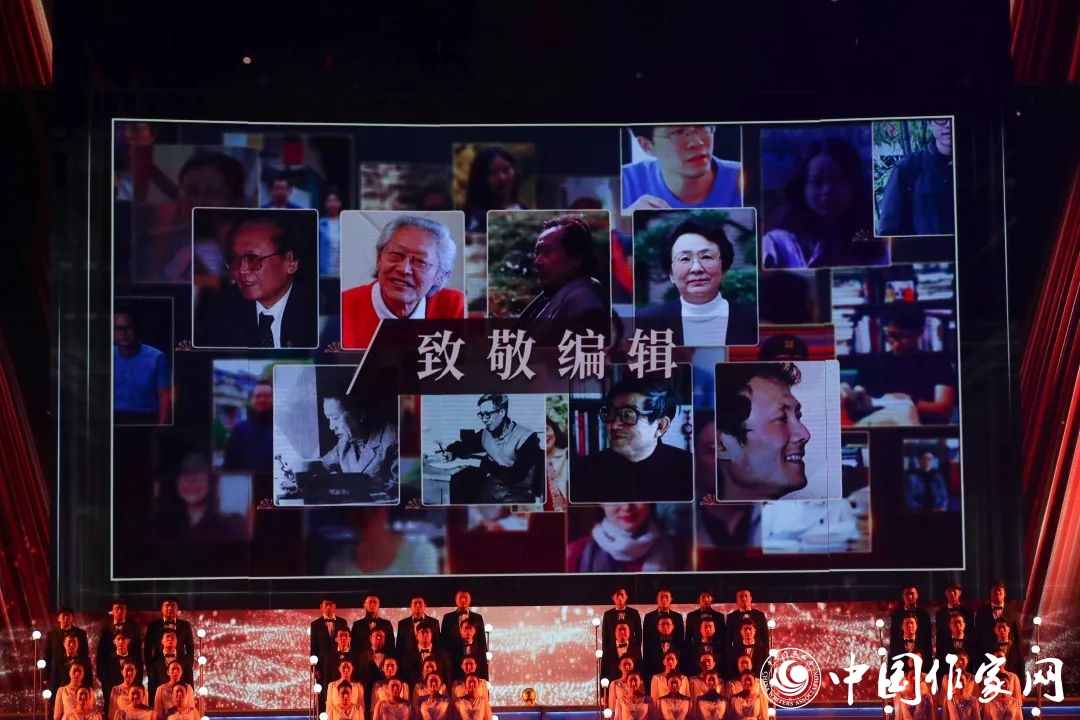 晚會舞臺上,每一位獲獎者從“書簽”的幕后走到臺前,象征著他們從自己的作品、從思想和探索中走向廣大讀者和觀眾。主持人與獲獎代表互動的環節,受到觀眾熱烈歡迎,索南才讓、董夏青青等有著特殊身份和特殊經歷的獲獎作家,在現場分享了他們獨特的生命經歷與創作歷程,描繪他們眼中的新時代文學風景,講述他們筆下動人的“中國故事”,喚起廣大作家強烈的使命感和榮譽感,在全社會凝聚起更加磅礴的文學力量。晚會還特意安排“致敬編輯”環節,感謝為中國文學作出無私奉獻的廣大編輯們,馬天牧、李黎、李偉長、李亞梓、吳越、趙萍、季亞婭作為獲獎作品責任編輯代表上臺,接受致敬。