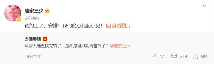 面對潘粵明的許愿:“斗羅大陸五快完結了,是不是可以期待番外了?”,唐家三少回應稱:“預約上了,安排!我們晚點兒起點見!”