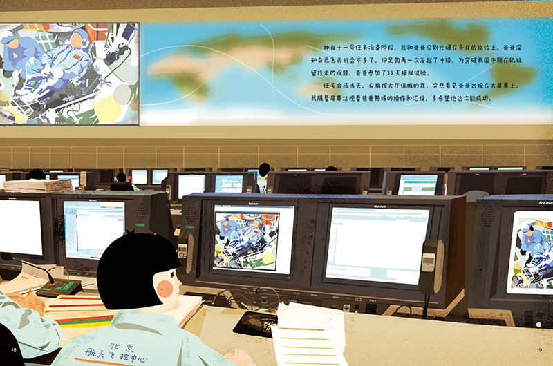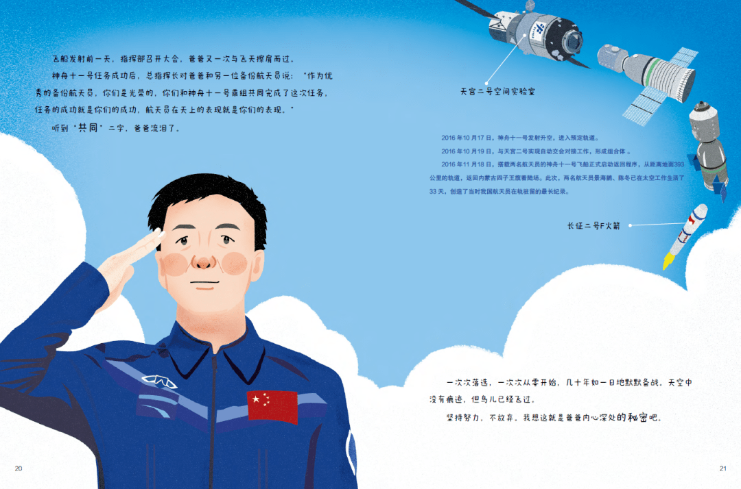 趙墨染:2016年我在清華美院讀書的時候選擇做科普繪本的研究,有了一些科普繪本的創作經驗。2018年中國少年兒童新聞出版總社的唐威麗老師聯系到我說有這樣一個航天員的故事,問我感不感興趣。本身我對航天題材也很感興趣,看了鄧清明父女《朗讀者》的節目后,被深深地打動了。之后在出版社的安排下我和鄧清明的女兒滿琪見面了,自此開始了我們三年的創作之旅。這三年我們線上線下溝通了多次,她給我提供了非常詳盡的資料。比如故事的腳本,相關的影像資料,參考書籍、電影和紀錄片等等。從文字到分鏡圖再到正稿,滿琪很認真地校對每一處。因為她作為航天人的專業背景,有她在我會很踏實。說到印象最深的瞬間是神舟十一號任務準備階段,滿琪在指揮大廳值班看到爸爸出現在大屏上,她眼含淚水的樣子讓我難忘。