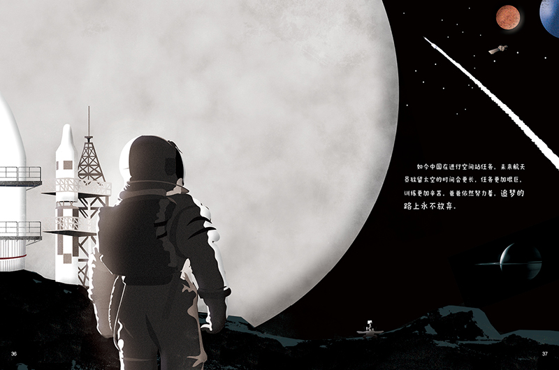 趙墨染:科普類型的繪本創作更需要大量的資料研究和科學求真的精神。盡可能多看資料,多去實地考察。就怕創作時需要畫,卻沒有素材可參考。要在有限的體量內,講清楚想表達的故事,對資料的分類整理必不可少。如何將這些素材編輯好,講好這個故事也是研究重點。比如一開始做《爸爸的秘密》這本書,書中涉及航天專業知識的圖形化對我來說確實是個難關,但隨著創作的深入,資料收集越來越充分時,我開竅了,也得心應手起來。關于航天員訓練、中國航天大事記、航天器等畫面我運用了視覺傳達設計中的信息圖表的方法,按照時間線分類以及做兒童喜歡的圖形化的設計,在排版上注意圖文的關系,讓讀者更清晰地了解這些科普知識。總結而言是對內容的理性梳理和感性呈現。