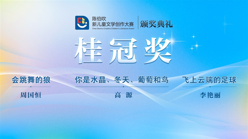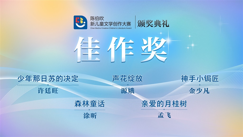 12月16日,首屆陳伯吹新兒童文學創作大賽頒獎典禮暨上海譯文童書中心成立五周年紀念活動在世紀出版園舉行。《少年那日蘇的決定》《聲花綻放》《神手小鋦匠》《森林童話》《親愛的月桂樹》獲得“陳伯吹新兒童文學創作大賽佳作獎”,《會跳舞的狼》《你是水晶、冬天、葡萄和鳥》《飛上云端的足球》獲得“陳伯吹新兒童文學創作大賽桂冠獎”。