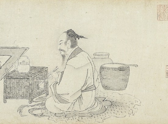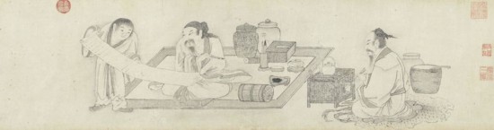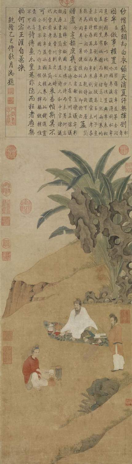 錢選(約1235—1307年),字舜舉,號玉潭,浙江吳興人,為宋末元初的著名畫家。此畫設色明艷,筆畫精細。 畫中茶器,以朱泥宜興茶壺煮茶,是明代中期以后的葉茶泡法。畫中三人,一煽火烹茶,爐上置單柄壺,旁置一雙層朱泥提梁壺;正面白衣文士為唐代詩人盧仝(約795—835年),身旁擺放三足朱泥茶壺、白瓷茶甌、朱漆茶托、書畫冊等,反映出文人相聚,品茗論書的隱逸生活。
