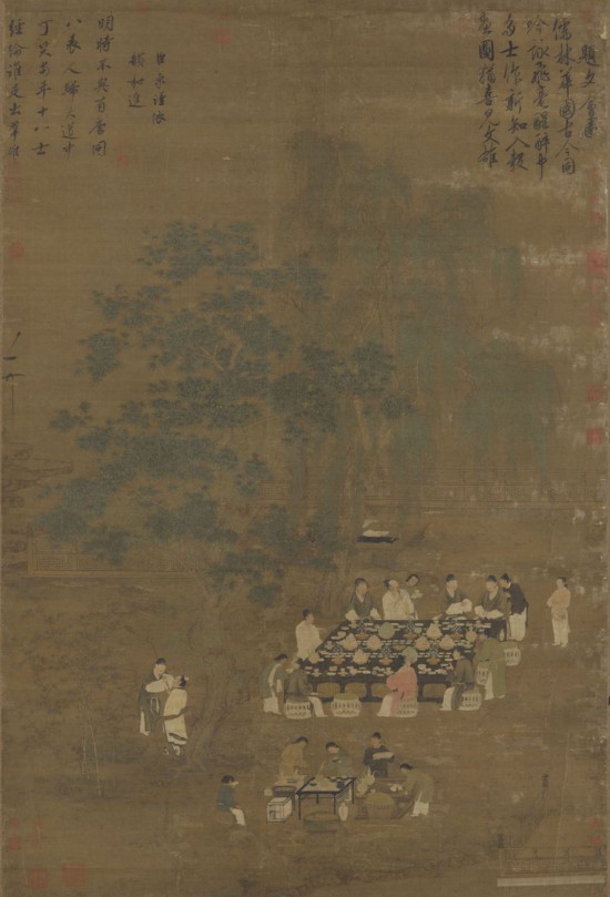 本幅描繪池邊大樹下,一群文士正據案飲宴。前方有僮仆在一小桌上備茶,其中一人手持長柄匙自茶罐舀取茶末,沿用的是唐末以來盛行的“點茶法”。人物皆神情雅俊,衣褶挺勁生動。竹樹具用雙鉤,筆筆細勁,如鋼針鑴鐵,必盡全力。通幅筆跡繁細,千絲萬縷,而無一懈筆,蓋極精妙之能事矣。此畫庭臺器具描繪得極為華美,有別于五代時文會圖簡單的背景,北宋的文會圖系置于完備的花園場景之中,由此也反映出北宋園林的發達。此圖右上雖有徽宗題詩,左中有他的畫押,左上另有蔡京題詩,但俱屬可疑,應是畫院中名手之作。
