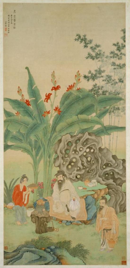 圖中描繪出唐代名士盧仝煮茶的情景,是丁云鵬晚年創作的工筆精細畫作。盧仝(約796—835年),濟源人,祖籍范陽(今河北涿州),早年隱居少室山,自號玉川子,后移居洛陽。詩文俱佳,曾作《月蝕詩》以刺時政,得到韓愈的稱贊。性好飲茶,所作《茶歌》中句多奇警。畫面上的盧仝身著便服,頭戴襆巾,手持羽扇,單腿盤坐于芭蕉前的青石上,背后怪石嶙峋,修竹碧綠,兩名仆人在旁侍候。盧仝目不轉睛地注視著火上的茶爐,全神貫注的神情被刻劃得細致入微。畫面花、竹、芭蕉筆筆刻畫工整,怪石的陰陽、紋理交代清晰,賦色清淡冷雋,蔥翠欲滴,閑和嚴靜的幽雅氣氛直撲人面。人物衣紋則用飄灑不群的高古游絲描,或清圓細勁的鐵線描,以區別不同質地的衣料,顯示出畫家別具匠心之處。全圖的繪畫技巧變化多樣而風格基調統一,人物神情生動,樹石生機勃勃,筆法如行云流水,超然出眾。