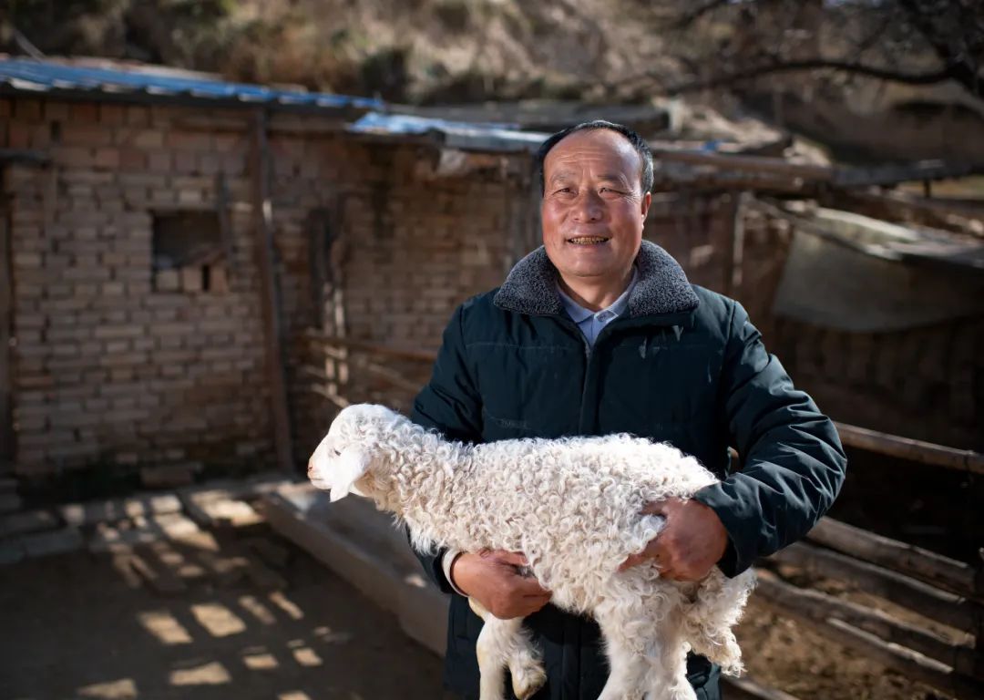 11月16日,寧夏西吉縣農(nóng)民作家李成山抱著家中的小羊羔 馮開(kāi)華 / 攝