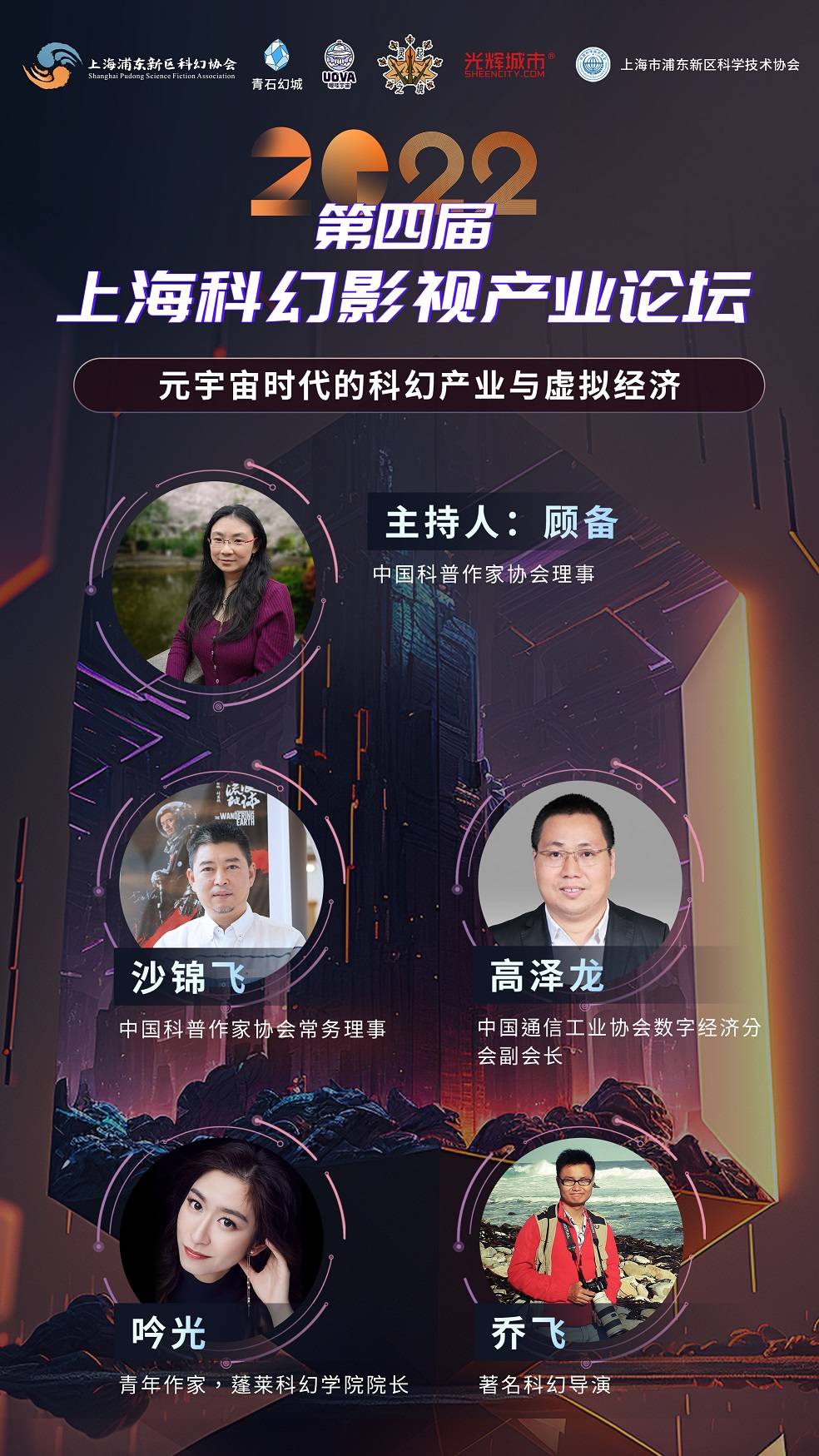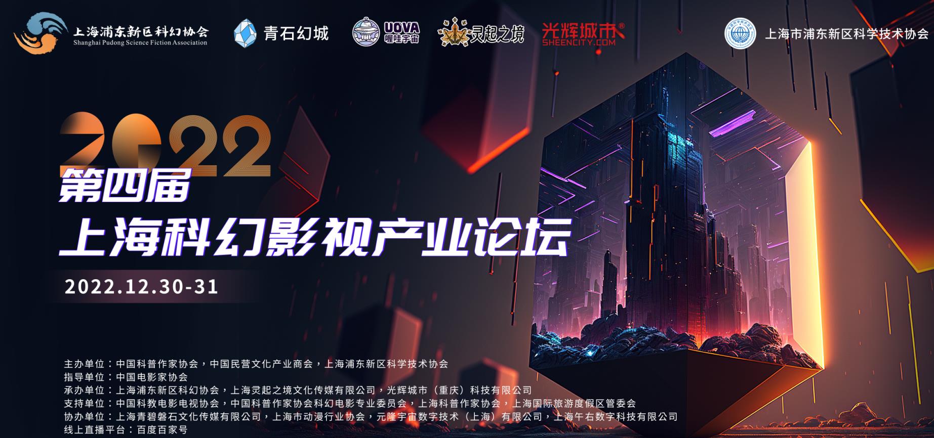 12月30日-31日, 2022第四屆上海科幻影視產業論壇以線上直播的形式舉行。本次論壇由中國科普作家協會、中國民營文化產業商會、上海浦東新區科學技術協會主辦,中國電影家協會任指導單位,中國科教電影電視協會專業工作委員會、科幻委員會,中國科普作家協會科幻電影專業委員會,上海科普作家協會和上海國際旅游度假區管委會,全國少兒科幻聯盟等任支持單位,上海浦東新區科幻協會、上海靈起之境文化傳媒有限公司、光輝城市(重慶)科技有限公司等共同承辦。在聚焦科幻影視產業發展的基礎上,本屆論壇將重點關注元宇宙時代下科幻數字文娛產業與元宇宙技術的結合與未來展望,以多個專場論壇、高層對話及項目路演的形式,帶來一系列2022年最新科幻元宇宙技術與科幻文娛產業結合的技術分享與成果展示,全面推動科幻元宇宙產業聯動與合作。