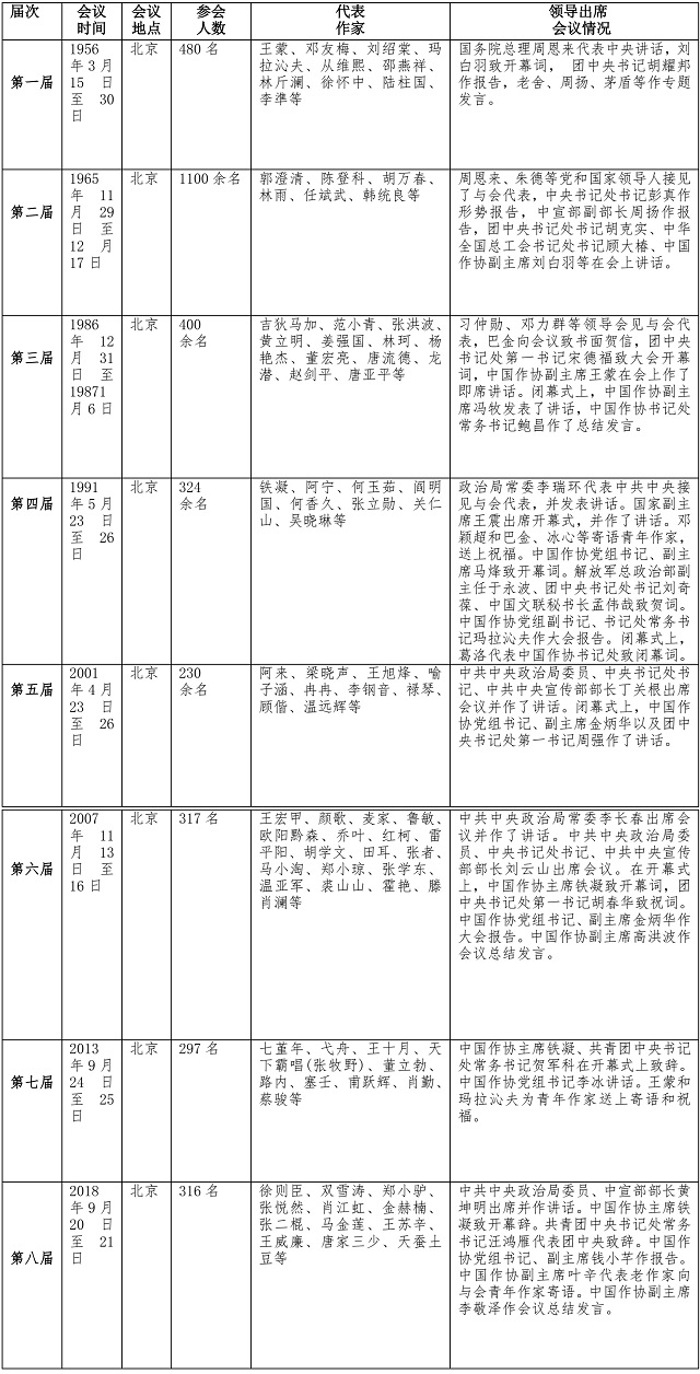 由此而后,我國的“青創會”逐漸衍成慣例,成為了青年作家成長成才的展示舞臺,也受到了黨和國家的高度重視。幾乎每次“青創會”都會有黨和國家領導人親臨會場,或與代表合影留戀,或發表重要講話,也有老作家對青年作家寄予厚望,提出希望。可以這樣說,“一次又一次的青創會見證了中國社會主義文學事業的繁榮發展,一代又一代的青年作家從這里汲取前行的動力”11。到目前為止,全國“青創會”一共舉辦了八屆,歷屆參會作家達3460余人(見下表)。
