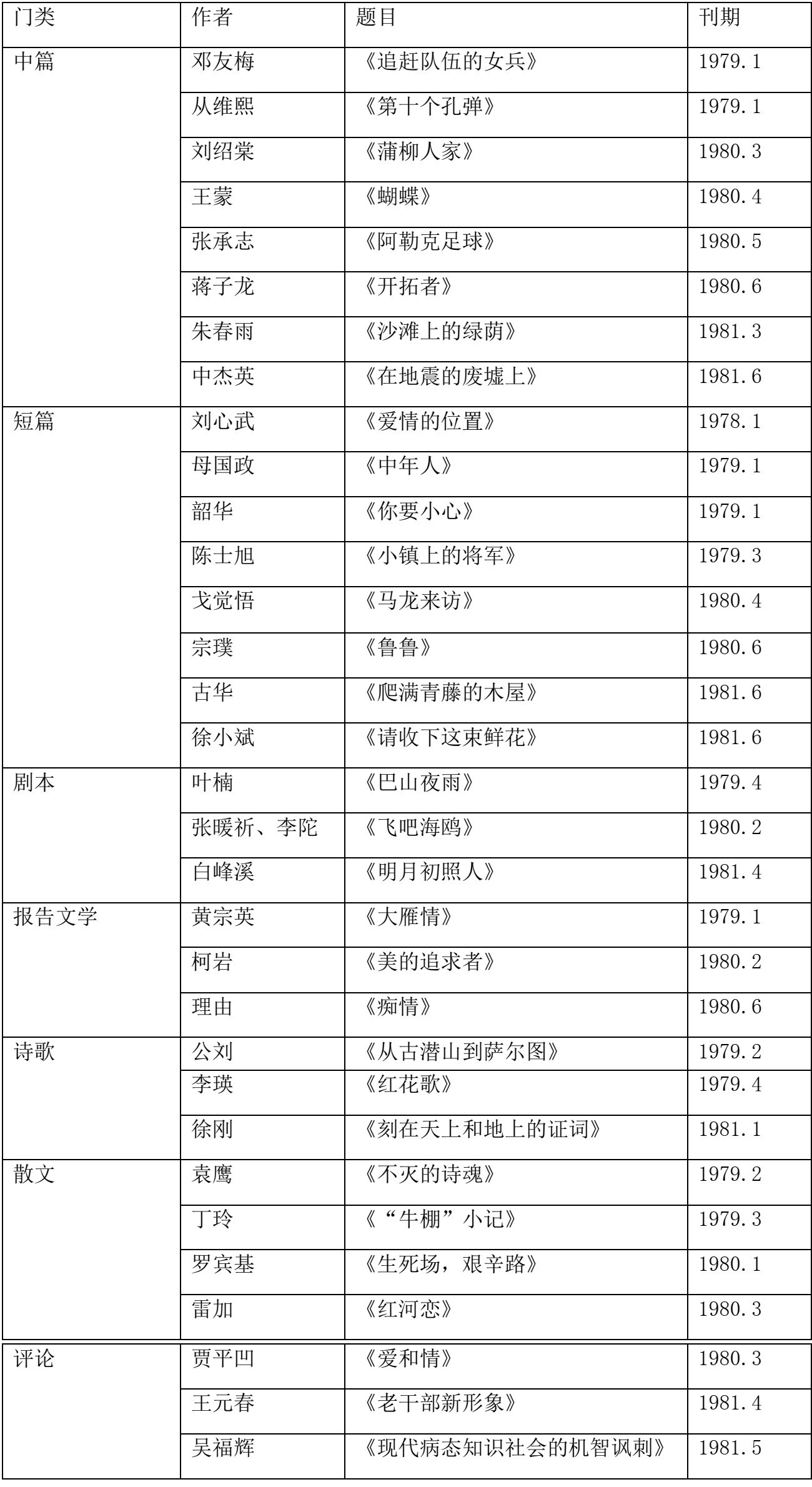 表1:首屆《十月》文學獎獲獎作品(1978—1981)