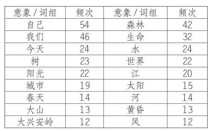 通過對詩集意象進行梳理(見圖1),筆者發(fā)現(xiàn)“森林”在《極地漫步》中出現(xiàn)42次。“森林”特指“大興安嶺”,“大興安嶺”則在詩集中出現(xiàn)12次。詩人魯微在與“森林”對話時,將“森林”賦予詩性、神性意味。“森林”,不是人類索取資源等物質(zhì)財富的寶庫,而是植物動物等生命安居的家園,代表著詩人的某種信仰。它超越了沉重的感情,超越了烏托邦意識。這種對“森林”的情感化為彌漫在詩歌中的“森林意識”。在詩人魯微的筆下,“森林”的背后不單單是構(gòu)成森林的生物,它不單是題材和背景,還形成了魯微獨特的創(chuàng)作個性。