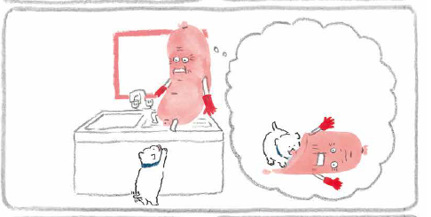 《香腸爺爺》的故事發生在一個遙遠的星球,在這個星球上居住著許多人們日常所見的生活用品,有茶壺茶杯母子、老式電話夫婦、蠟筆兄弟等等,香腸爺爺也在這里出生,長大,變老。直到香腸媽媽的離世,香腸爺爺開始了寂寞的獨居生活。一日,被遺棄的小狗的出現,打破了香腸爺爺原有的生活,在小狗的陪伴下,他開始變得有了牽掛,擔心失去,害怕離別。作者安寧達用四個章節來構建這個故事。第一章是香腸爺爺的誕生,第二章是香腸爺爺和小狗的相遇,第三章是香腸爺爺和小狗的告別,第四章是香腸爺爺死后在另一個星球上的生活。故事的展開一氣呵成,每個人都能讀到自己曾經歷的那些悲歡離合,從中體會生命的意義,并得到溫暖的慰藉。
