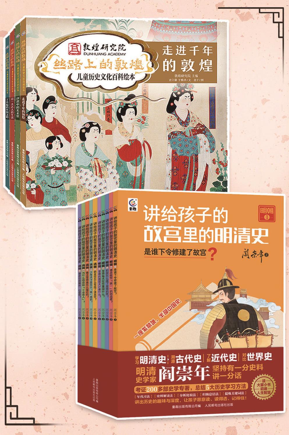 《絲路上的敦煌:兒童歷史文化百科繪本》開啟妙趣橫生的歷史穿越之旅。 《講給孩子的故宮里的明清史》共十冊,串聯起建筑、典籍、文物等多方面知識。(均出版方供圖) 制圖:馮曉瑜