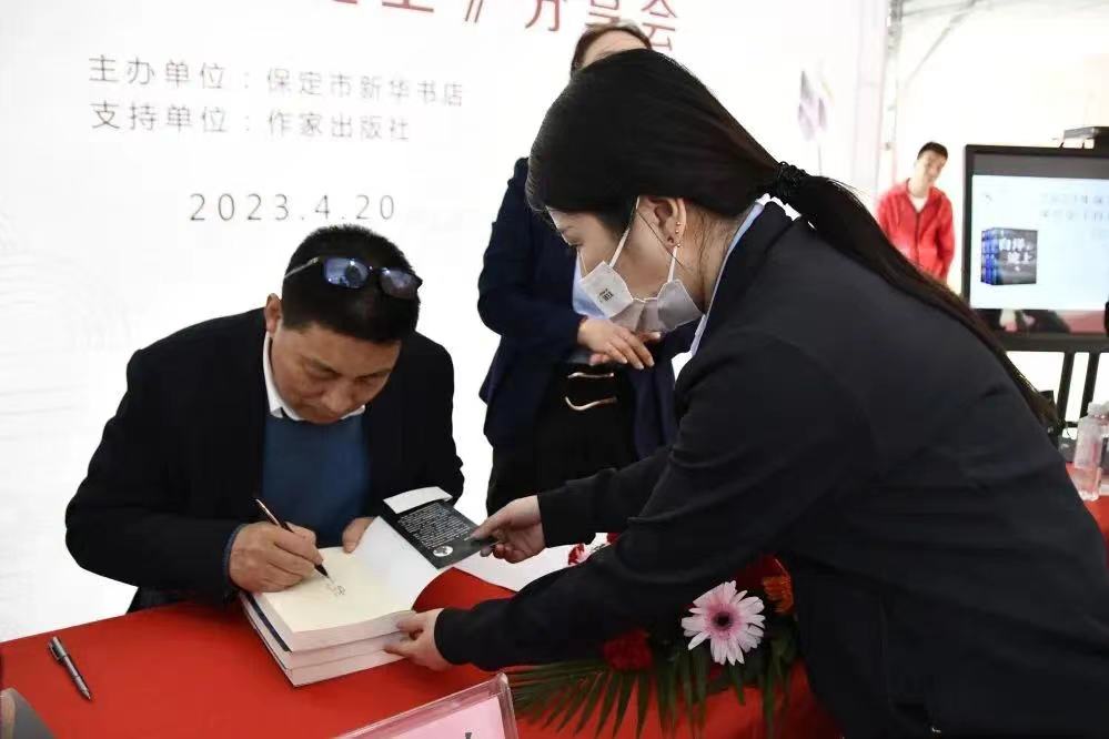 主會場啟動儀式結束后,與會領導與嘉賓來到書市現場參加了關仁山《白洋淀上》分享會,聆聽其創作經歷,并簽名留念。