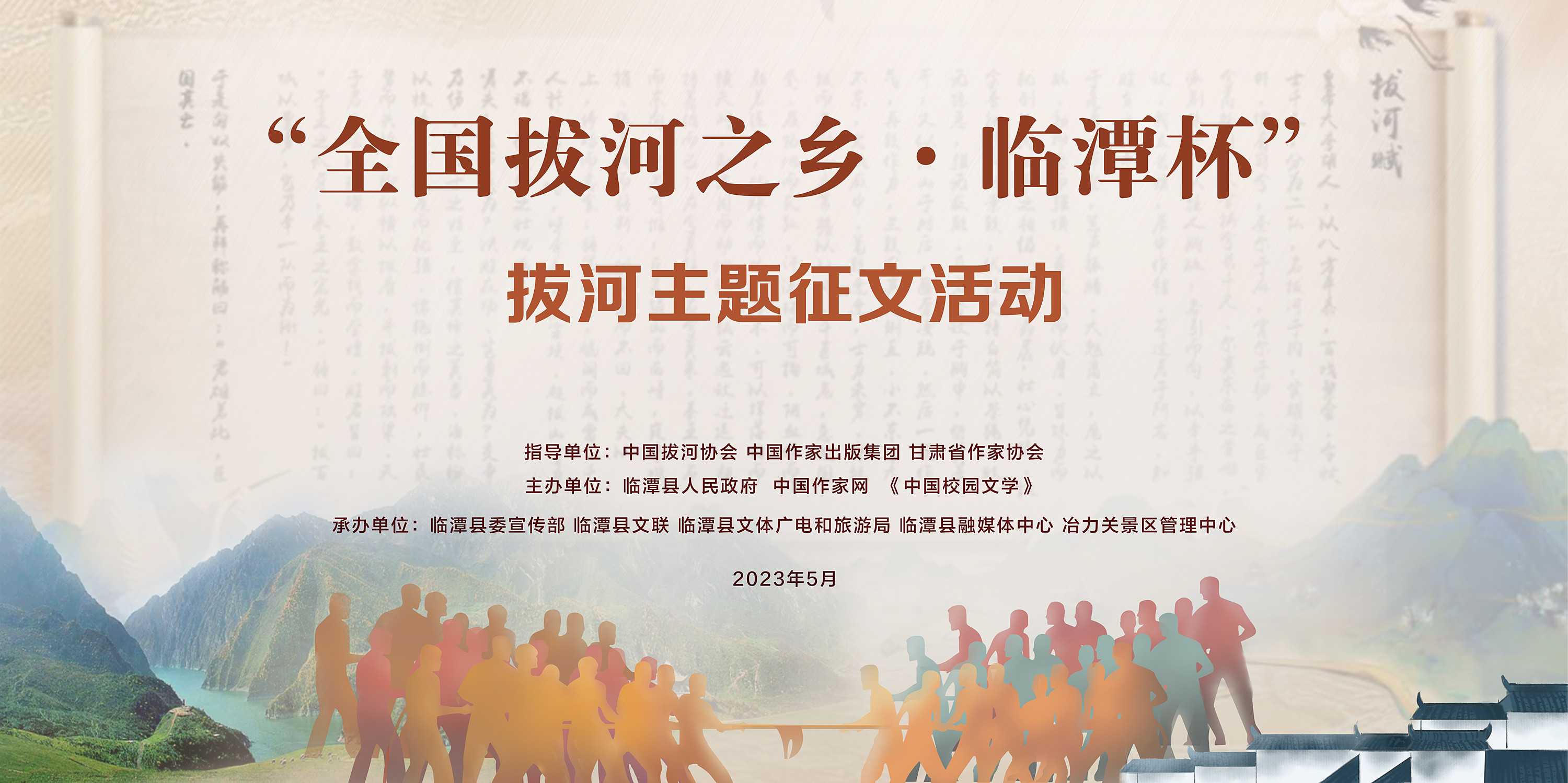 為深入貫徹落實黨的二十大精神,弘揚全社會團結奮斗的精神標識,挖掘、刻畫、弘揚、傳播拔河運動承載的文化內涵和精神力量,助力全國拔河之鄉·臨潭縣國家級非遺項目“萬人扯繩(拔河)”文化品牌傳播,增強中華優秀傳統文化自信,經臨潭縣人民政府和中央定點幫扶單位中國作家協會商議,決定以文學的方式記述展示拔河這一群眾體育、民俗活動的獨特魅力,以匯集到的優秀文學作品豐富全國拔河文化發展成果,為脫貧縣新時代經濟社會高質量發展注入精神力量。值此今年7月2023“冶力關杯”中國拔河公開賽暨第七屆甘肅·臨潭拔河節(擬定名)即將舉辦之機,為配合賽事品牌宣傳,進一步挖掘弘揚“一根繩,一條心,一股勁”的拔河精神,在中國拔河協會、中國作家出版集團、甘肅省作家協會等單位指導協作下,特面向全國舉辦該主題征文活動。