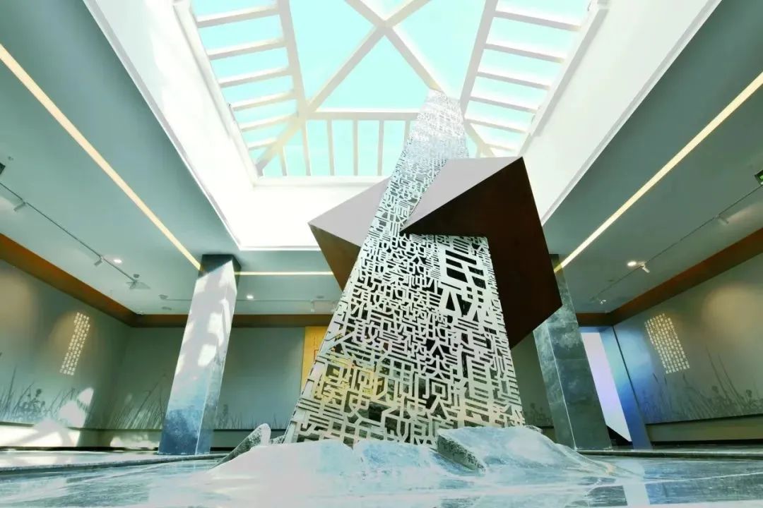 展覽序廳的中央設置的藝術雕塑,是一個幾何造型金屬鏤空的三角形裝置,由魯迅著作篇名和名言警句鑲嵌連綴而成,下大上小,拔地而起。金屬字的棱角表現魯迅文字的犀利。這可以是一座語言的巴別塔,也可以象征文學家的如椽巨筆。在鋼柱的中段,有一個緊箍鋼柱但卻正被沖破的鐵銹正方體,讓人聯想到《〈吶喊〉自序》中魯迅與錢玄同那場著名的“鐵屋對”。用了三角形,是因為魯迅曾說過:“生命的路是進步的,總是沿著無限的精神三角形的斜面向上走,什么都阻止他不得。”當然,雕塑的象征意義可以有多重解釋,觀眾可以在這里沉思回想,體會魯迅精神世界的豐富性和復雜性。