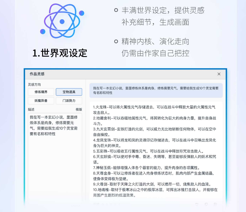 黃琰仔細講解了“作家助手妙筆版”的四大功能:世界觀設定、角色設定、情景描寫和打斗描寫,舉例展示了這些功能如何幫助作家豐富細節(jié)、輔助創(chuàng)作、提升效率等。比如,世界觀設定是網(wǎng)文創(chuàng)作前期籌備的重要內容之一,涉及武力值、地圖、門派勢力等多重細節(jié),“作家助手妙筆版”的世界觀設定功能,能為作家豐滿世界觀設定,生成大段內容補充,并完善細節(jié)。但世界觀的精神內核、演化走向,仍需作家自己把握。