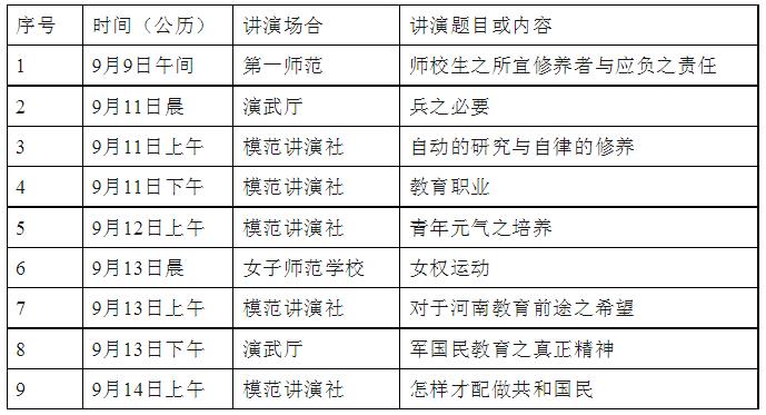 綜合以上考證,1922年9月9日至14日,在汴期間梁啟超至少發表九次演說,為直觀呈現,可列表如下: