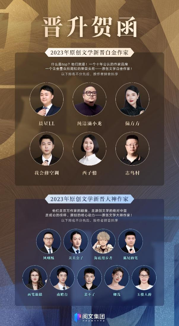 近日,閱文集團發(fā)布2023年新晉“白金大神”名單。其中,晨星LL、純潔滴小龍、偏方方、我會修空調(diào)、西子情、志鳥村等6名作者獲得“白金作家”稱號,鳳嘲凰、關關公子、畫筆敲敲、海底漫步者、狐尾的筆、南瞻臺、裴不了、卿淺、玉樓人醉等9名作者摘得“大神作家”榮譽。至此,閱文旗下白金大神作家人數(shù)達458位。