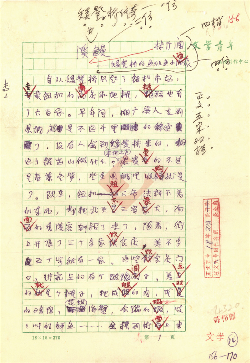 1984年第10期的《人民文學(xué)》雜志,同時(shí)發(fā)表了林斤瀾的兩部短篇小說(shuō)《溪鰻》和《車(chē)鉆》,這是他“矮凳橋風(fēng)情系列”小說(shuō)中的兩篇。“矮凳橋風(fēng)情系列”由21篇中短篇小說(shuō)集結(jié)而成,以溫州“矮凳橋”為背景,人物和情節(jié)互有聯(lián)系,又獨(dú)立成篇,是中國(guó)當(dāng)代文學(xué)史上短篇小說(shuō)的代表作。中國(guó)現(xiàn)代文學(xué)館藏有《溪鰻》《車(chē)鉆》《李地》等多部“矮凳橋”系列小說(shuō)手稿,多為《人民文學(xué)》雜志社捐贈(zèng)。從“人民文學(xué)稿箋”可以看到編輯的刊發(fā)意見(jiàn):“若兩篇同期發(fā),可請(qǐng)作者自己考慮一個(gè)總標(biāo)題。”《溪鰻》手稿首頁(yè)上端中間位置有“矮凳橋傳奇”字樣,明顯是編輯后加上去的,這應(yīng)該就是“矮凳橋風(fēng)情系列”的前身了。【詳細(xì)】