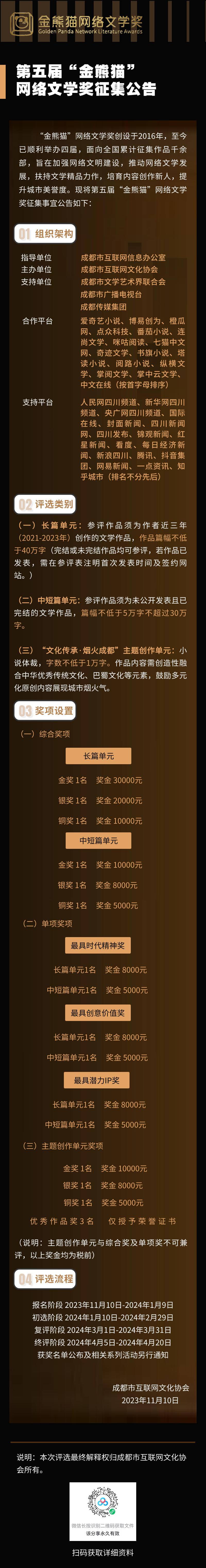 “金熊貓”網絡文學獎創設于2016年,至今已順利舉辦四屆,面向全國累計征集作品千余部,旨在加強網絡文明建設,推動網絡文學發展,扶持文學精品力作,培育內容創作新人,提升城市美譽度。現將第五屆“金熊貓”網絡文學獎征集事宜公告如下: