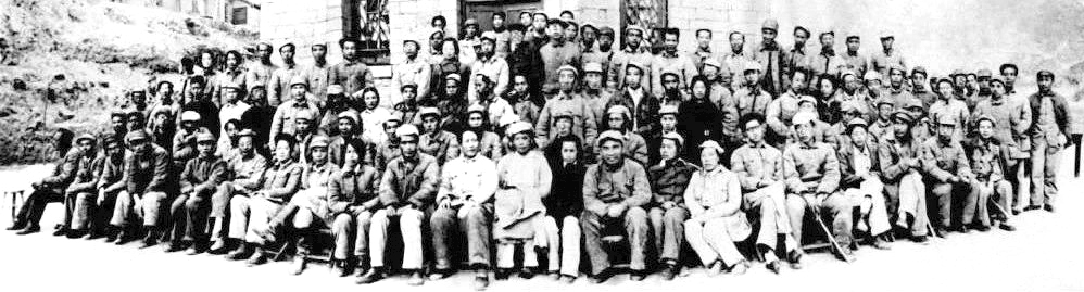 “毛主席和延安文藝工作者在1942年5月延安文藝座談會開會期間的合影”(前排左起第9位為草明) 吳印咸 攝