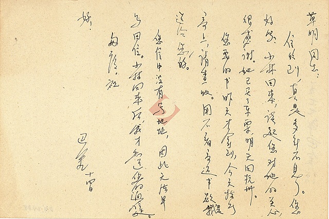 “今天看到小林了,十分高興!十幾年未見,她已長大成人了。并且已做了母親,工作也好多年了。她對我還是那么親熱,很談得來。從她那兒,了解了上海文藝界一些熟人的情況,也了解了你們家的一些情況。是的,十多年來,彼此的變化是很大的。總的說來,我們老一代的,長了不少見識,也可以說路線斗爭的覺悟提高了。總算看到林彪、四人幫那些黑幫的覆滅;也看見一些敗類一個一個地露出尾巴來!勝利是永遠屬于人民的啊!我們文藝工作者生活在這樣偉大的時代,目睹人民(也包括我們自己)的多次歷史性的斗爭的勝利,應該自豪,應該為我們英雄的人民大唱贊歌啊。是不是這樣哩?寫吧,同志。
