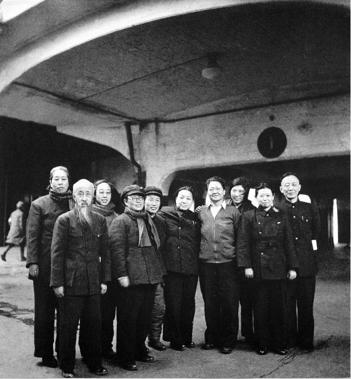許廣平(左一)、沈鈞儒(左二)、郭沫若(右一)、羅淑章(右三)、李德全(右四)等民主人士離開沈陽前在火車站合影。