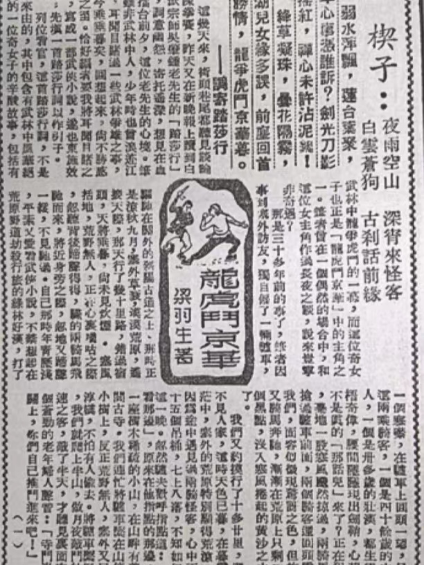 預告已出,不寫看來是不行的了,陳文統只得被迫當天便開始撰寫小說。20 日,一篇署名“梁羽生”的小說《龍虎斗京華》開始在《新晚報》“天方夜譚”欄目連載。小說一共連載7 個月,在香港讀者中引起了熱烈反響。《龍虎斗京華》是梁羽生的處女作,也是他的成名作。因為有了它的連載,不僅《新晚報》銷量看漲,梁羽生在香港也是一炮走紅。《龍虎斗京華》連載結束后,梁羽生本想休息一下。但看到讀者反映如此強烈,羅孚又“逼著”梁羽生創作出了《草莽龍蛇傳》,該小說是《龍虎斗京華》的姊妹篇,它以義和團和大刀會的興衰為經,以上官瑾、杜真娘與丁曉、姜鳳瓊兩對英雄兒女的愛情故事為緯,譜寫了大時代的史詩中的俠骨柔情。1955年2月初,《草莽龍蛇傳》連載結束后,疲于寫作的梁羽生堅決跟羅孚表示要“請假”,自己需要調整一下,加之當時還有一些其他重要事務要忙,實在無暇再在《新晚報》連載寫稿。