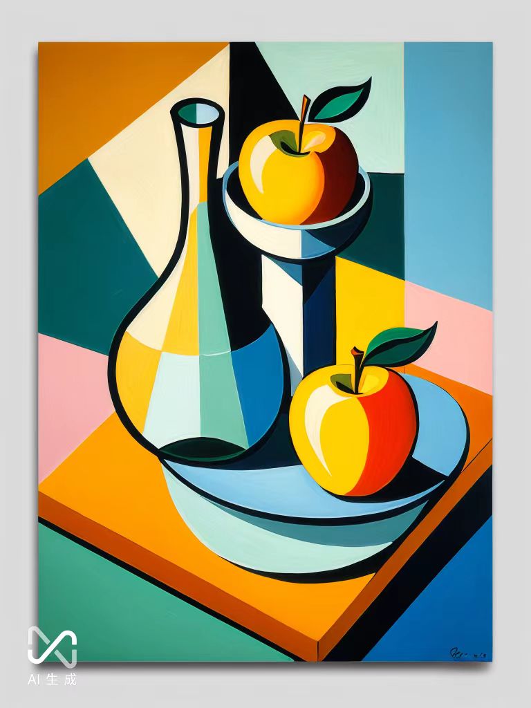 AI的立體主義風格“蘋果”畫好啦,不得不說,蘋果仍然是我們熟悉的樣子,關鍵詞“抽象”并未得到準確體現。