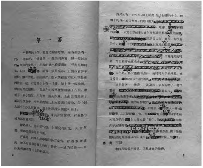 曹禺一向不注意留藏自己的手稿和著作,不過(guò)他在書信中對(duì)修訂進(jìn)展的描述,可以為重構(gòu)曹禺修訂方法提供一些基本思路。從曹禺致李致的書信中,可以看到,在為“川版曹禺戲劇集”做修訂時(shí),《雷雨》《日出》《原野》《蛻變》《北京人》五部劇作選了“文化生活出版社”的舊本子作為底本來(lái)修訂,而他在校對(duì)時(shí),還會(huì)拿其他版本進(jìn)行比照,比如選了1957年中國(guó)戲劇出版社的單行本來(lái)校對(duì)《雷雨》,選了文化生活出版社的單行本來(lái)校對(duì)《原野》2。遺憾的是,上述修訂的原始稿件已不可見。值得慶幸的是,1961年人民文學(xué)出版社《曹禺選集》的編輯王仰晨非常細(xì)心地留存了當(dāng)年《雷雨》和《日出》兩劇的付印本(包括修訂手稿),從這兩個(gè)付印本可以清晰地看出曹禺當(dāng)時(shí)的修訂方法和策略。而這一《雷雨》付印本,可以視為《雷雨》各修訂版中唯一可見的完整手稿。