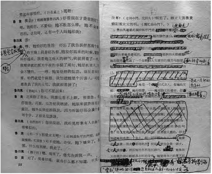 第一個(gè)段落主要批判胡風(fēng)派的作家。周揚(yáng)所總結(jié)的路翎小說(shuō)人物刻畫的問(wèn)題,所謂充滿了“原始野性”,充滿了神經(jīng)質(zhì)的瘋狂性、痙攣性的怪物,化了裝的個(gè)人主義者,難免不會(huì)讓在這段時(shí)間為文藝觀不能緊跟主流而焦慮的曹禺引發(fā)聯(lián)想,想到他所塑造的“野性”和神經(jīng)質(zhì)的個(gè)人主義者繁漪。因此,付印本中繁漪小傳刪去了“原始”“野性”的字樣。