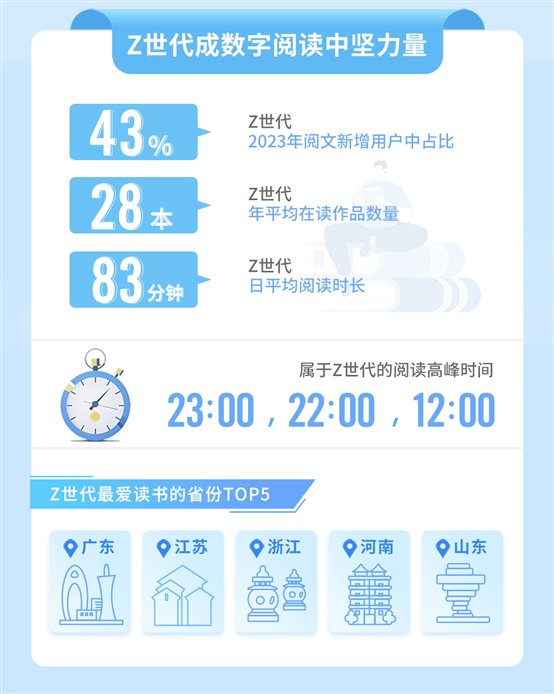 作為互聯網原住民,Z世代是數字閱讀的生力軍。閱文集團數據顯示,Z世代用戶全年在讀作品數達到28部,平均每天閱讀時長達83分鐘。其中,晚上11點、晚上10點和中午12點是閱讀高峰期。從地域上看,廣東、江蘇、浙江、河南、山東位列Z世代最愛讀書省份前五位。