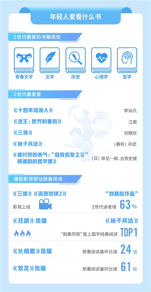 年輕人都在看什么書?《報告》顯示,青春文學、文學、歷史、心理學、哲學是Z世代最愛的五大出版書籍類型,《十四年獵詭人》《龍王:世界的重啟》《三體》《孫子兵法》《被討厭的勇氣:“自我啟發之父”阿德勒的哲學課》則是Z世代最愛看的出版讀物。