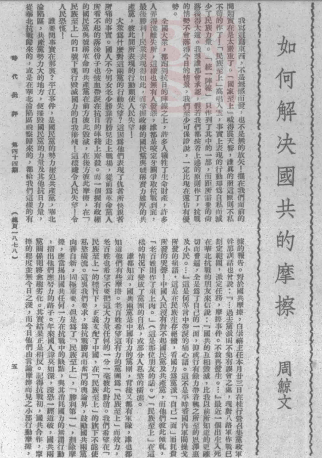 周鯨文《如何解決國共的摩擦》,《時代批評》1940年第2卷第44期